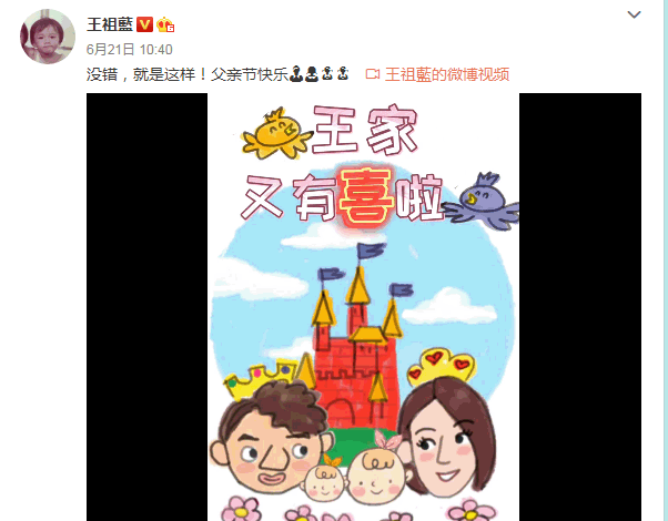 在昨日的父亲节,港星王祖蓝在微博上发布了一条父亲节快乐的小视频。视频中,其妻子和女儿均有出境,且借一岁多女儿之口向大家分享了怀二胎的喜讯。最后,在视频的后面分享了一张图片,标为“王家又有喜啦”,且图片上除了卡通的祖蓝、其妻子和女儿之外,给另一个还没出生的BB也P了图,还有蝴蝶结装扮。因此,网友猜测已知晓了BB的性别,毕竟结果可以通过香港验血得出。